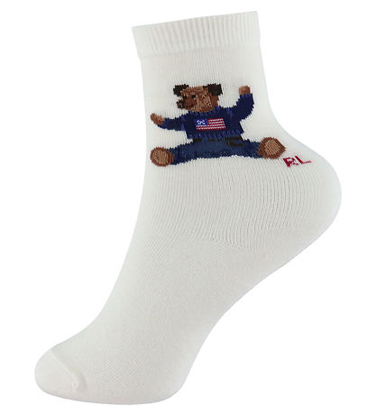 Superbes chaussettes Polo Ralph Lauren en 3 Pack: une paire rouge avec un peluche et un pull bleu, une paire blanche avec un peluche et une paire a rayures bleu marine et rouge avec le Polo Ralph Lauren. Les Chaussettes présentent un bord côtelé sur la tige.