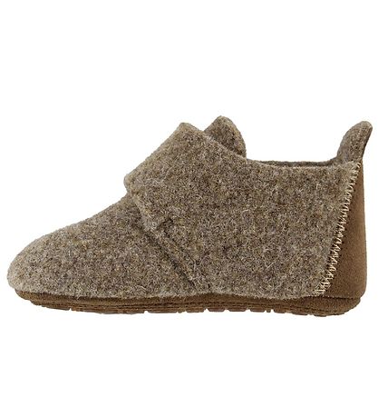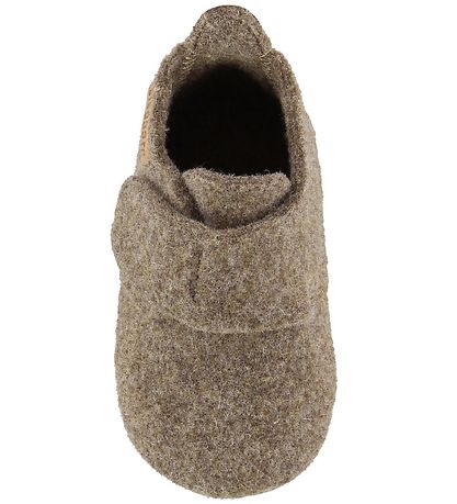 Magnifiques chaussons Bisgaard en laine feutrée marron clair avec daim marron sur le contrefort arrière.