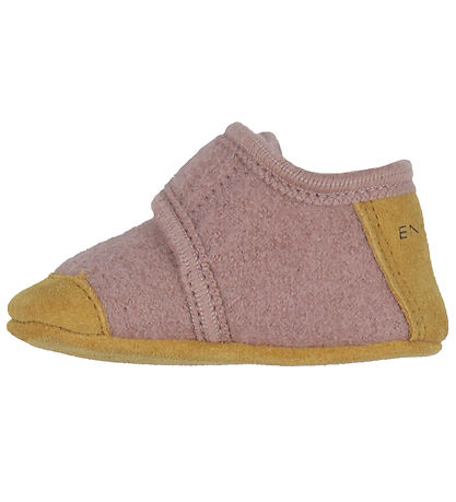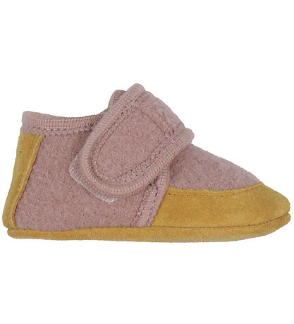 Adorables chaussons En Fant en laine rose avec daim marron clair sur le bout et le talon.