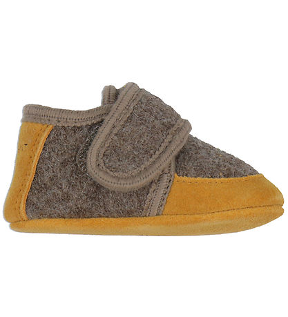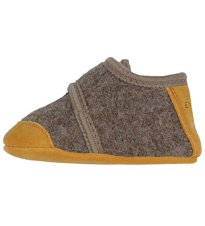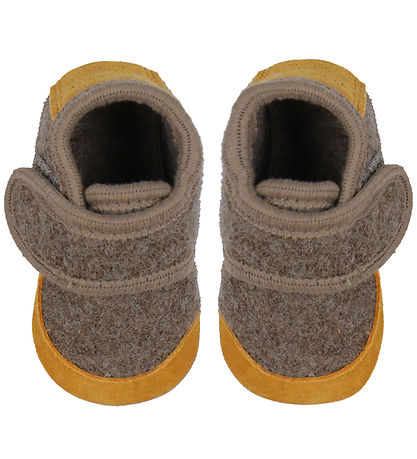 Ravissantes chaussons En Fant en laine marron foncé avec daim marron clair sur le bout et le talon.