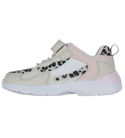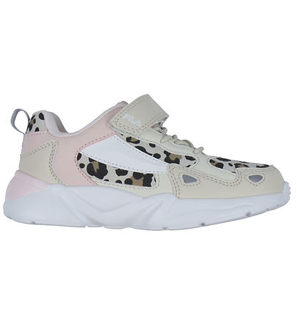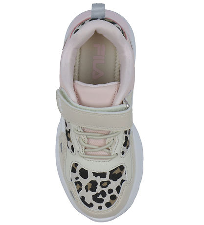 chaussures Fila élégantes en faux cuir beige et rose et en faux cuir beige avec imprimé léopard marron et noir. Elles sont ornées de petits détails réfléchissants et d'une semelle extérieure blanche.
