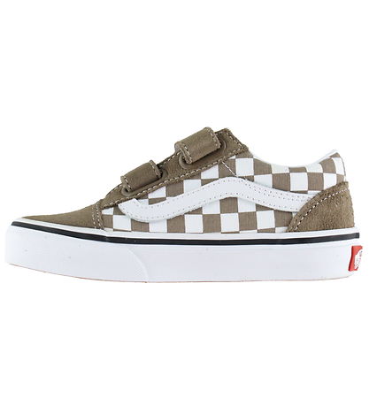 Jolies chaussures Vans en daim marron clair et textile à carreaux marron clair et blanc. Elles arborent un logo blanc sur les côtés et un logo rouge sur le talon.