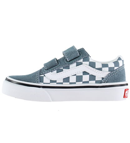 Élégantes chaussures Vans en daim bleu cendré et textile à carreaux vieux bleu et blanc. Elles arborent un logo blanc sur les côtés et un logo rouge sur le talon.