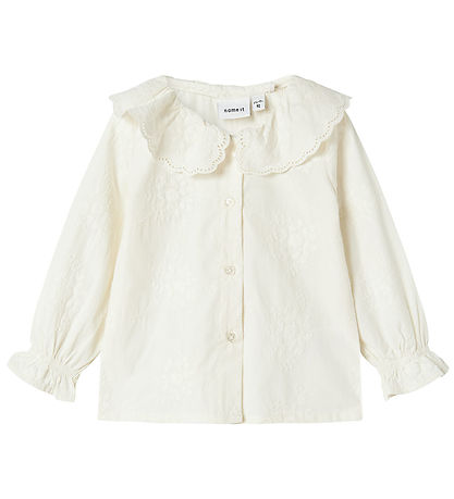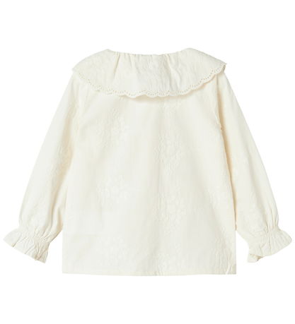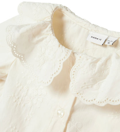 Élégante chemise Name It blanc cassé ornée de fines fleurs brodées. Chemise possède un large col bordé de dentelle décorative. Elle se ferme sur le devant par un boutonnage continu et possède des manches longues avec poignets élastiques.