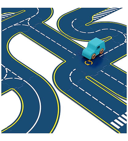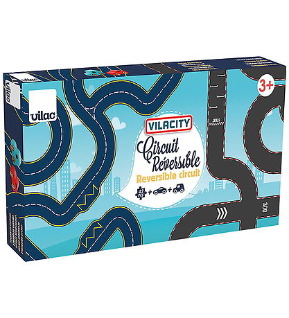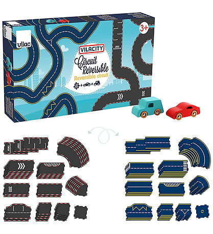 circuit de voitures Vilac amusant composé de 42 pièces en carton de différentes formes, à assembler de multiples façons pour créer un circuit de voitures. Le circuit est réversible : un circuit de voitures bleu foncé d'un côté et un piste de course pour voiture noir de l'autre. Une voiture bleue et une voiture rouge sont incluses.