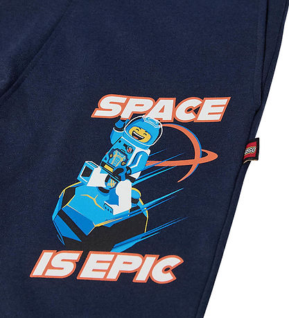 pantalon de jogging élégant LEGO® Wear City bleu foncé, orné d'un joli imprimé Rum sur la cuisse, entouré de l'inscription « Space is Epic ». Ce pantalon possède une taille ajustable, des poches avant ouvertes et un intérieur en coton brossé doux.