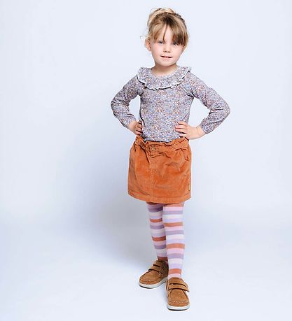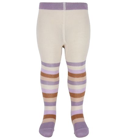 Magnifiques collants Hust and Claire de blanc, et sur les jambes il y a de fines a rayures rose poudré, marron et deux nuances de violet.