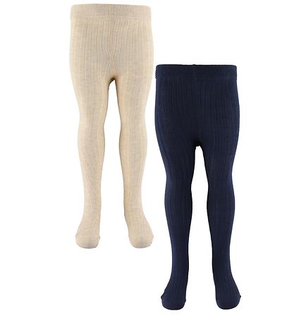 Collants Cool Minymo vendus en 2 Pack en bleu marine de couleur unie et beige chiné.