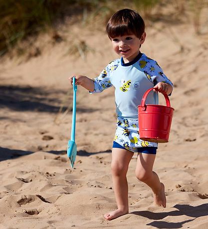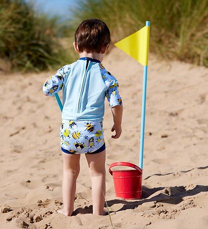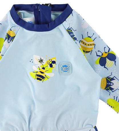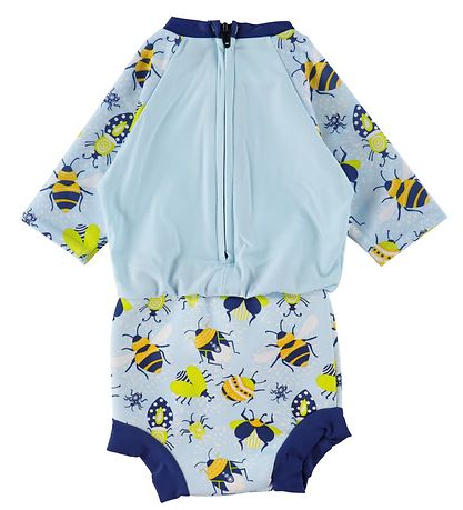 combinaison de plongée Smart Splash About en bleu clair avec un imprimé intégral de divers insectes dans des bords vert, jaune et marine et marine.