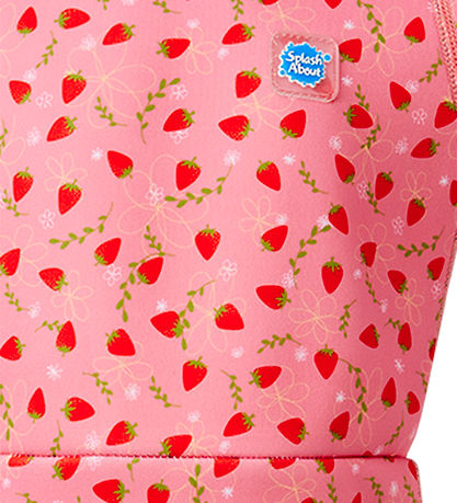 combinaison de plongée Smart Splash About rose avec un joli imprimé de fraise dans de jolies couleurs. La Combinaison de plongée a de larges bords rouges.
