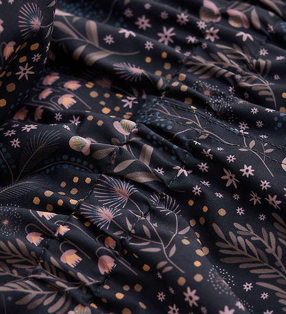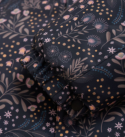combinaison de ski Lovely Color Kids en gris charbon foncé avec un imprimé floral intégral dans des tons rose, bleu et marron.