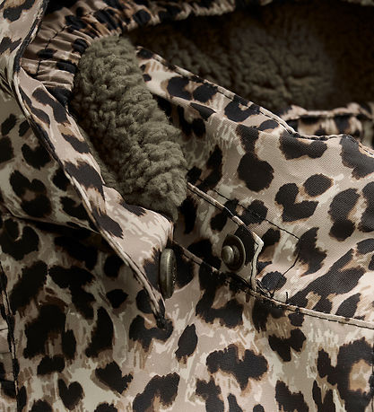 Jolie combinaison de ski En Fant à motif léopard noir et beige. Combinaison de ski est ornée d'un imprimé et d'un passepoil réfléchissants, ainsi que de jolis volants aux épaules.