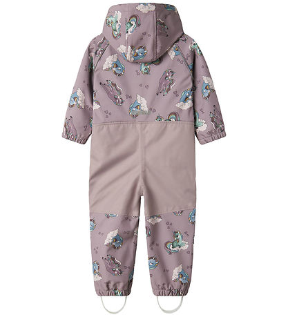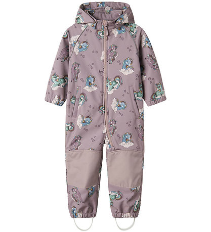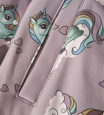 Jolie combinaison softshell Name It en violet cendré avec un fin imprimé intégral de licornes sur des nuages et des petits coeurs.