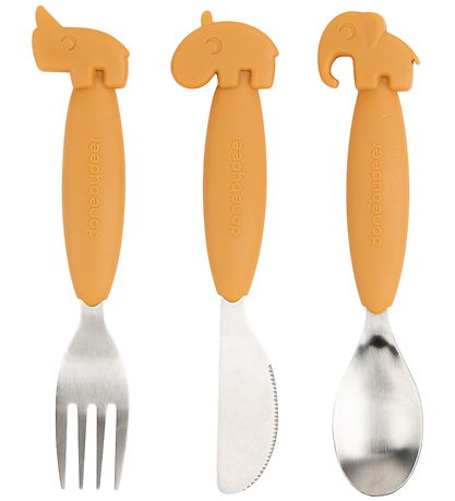 Charmant couverts Done by Deer composé d'une fourchette, d'une cuillère et d'un couteau, déclinés dans une teinte jaune moutarde. Ces couverts sont ornés de motifs animaliers amusants sur leurs manches, pour des repas plus conviviaux. Le Done by Deer est discrètement gravé sur le côté.