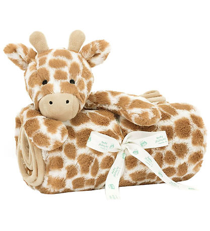Adorable couverture Jellycat marron et blanc avec un adorable ours en peluche girafe dans un coin.