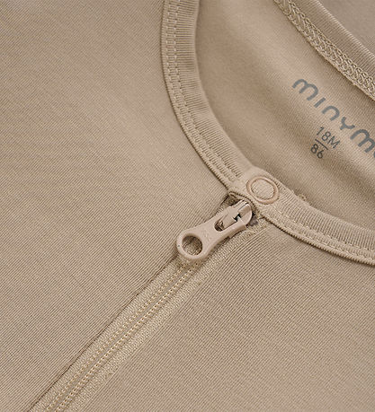 La grenouillère Minymo a des manches longues avec de larges bords côtelés et de longues jambes avec un tendeur pour des pieds fermes, si vous le souhaitez. Dans l'ouverture du cou se trouve un bord côtelé étroit et la combinaison s'ouvre sous le bouton-pression sur le devant au niveau de l'encolure, avec une fermeture éclair qui se termine à la cheville gauche. Grenouillère est confectionné dans une qualité douce et extensible.