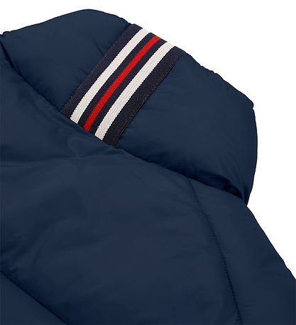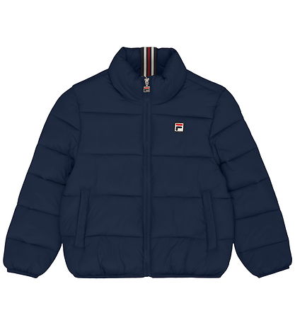 Élégante doudoune Fila d'un bleu marine profond, ornée d'un petit logo sur la poitrine. Veste larges coutures horizontales lui confèrent une allure élégante.