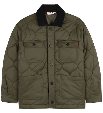 Magnifique doudoune HUGO vert militaire, en tissu lisse et motif matelassé. Le col est en velours côtelé noir et les boutons sont noir.