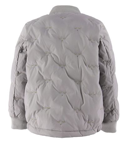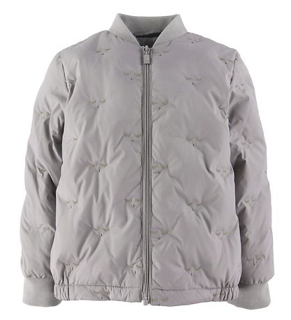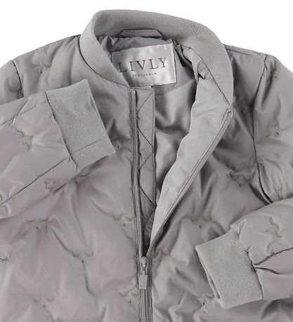 Jolie Doudoune Livly grise avec un motif imprimé complet d'un visage endormi, et la veste a une structure de qualité.