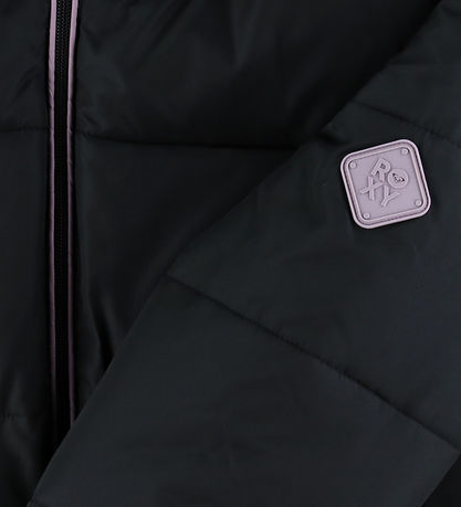 Magnifique doudoune Roxy noire avec surpiqûres horizontales et détails violets sous forme de passepoil et d'une application de logo en caoutchouc sur le bras supérieur gauche.