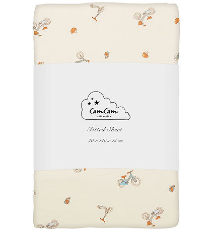 Fin drap de lit extensible housse Cam Cam Copenhagen en beige avec un imprimé all-over de jolis petits vélos dans des tons bleus, verts et marron.