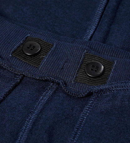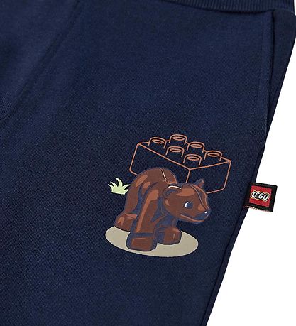 Adorable pantalon de jogging LEGO® Wear Duplo bleu foncé, orné d'un joli imprimé d'ours sur la cuisse, près d'une brique LEGO®. Il possède une taille ajustable, des poches ouvertes devant et un intérieur en coton brossé doux.