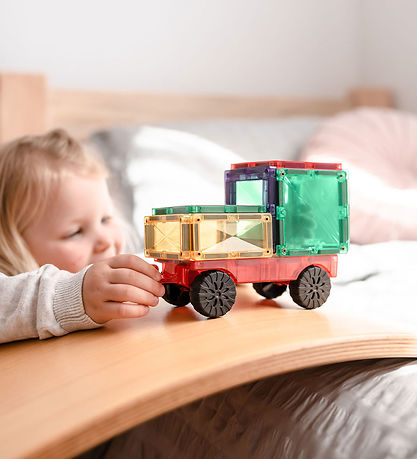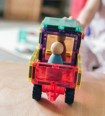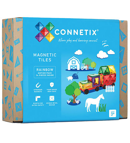 Aimant Connetix amusant aux couleurs vives de l'arc-en-ciel. Cet set contient 24 parties, dont pour fabriquer des véhicules.