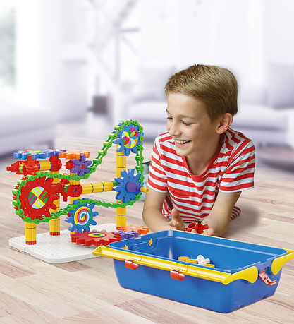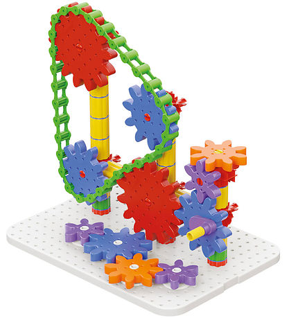 Jeu de construction amusant Quercetti avec des roues dentées colorées, qui peuvent être assemblées en une construction passionnante et tournées lorsque tout est assemblé sur la plaque de construction. Le coffret comprend :