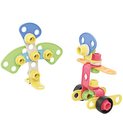 Joli bâtiment Quercetti dans de jolies couleurs, que l'enfant doit construire lui-même. Le jeu de construction contient 52 éléments de construction, y compris. des vis et des boulons, et seule l'imagination fixe des limites à ce qui peut être construit.