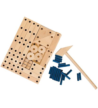 ensemble de construction Smart SES Creative composé d'un marteau en bois, d'un set de clous en bois et d'un set de formes en bois.