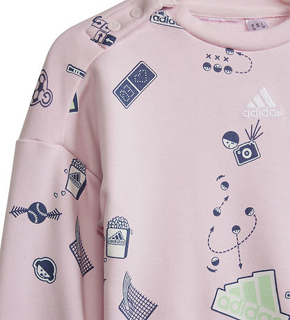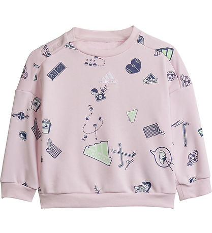 - Le sweat-shirt est rose, avec un imprimé complet du logo et divers motifs sportifs en bleu marine, blanc et vert.