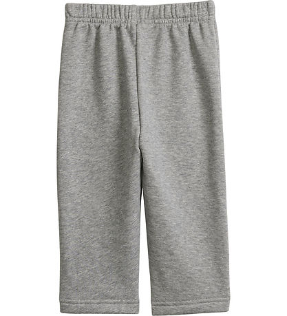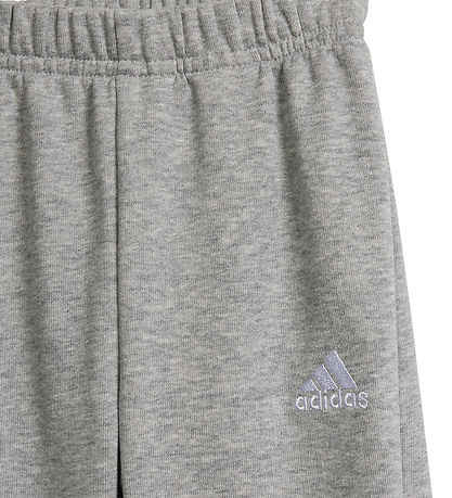 - Le pantalon de survêtement est gris chiné, avec un logo brodé en blanc sur la cuisse gauche.