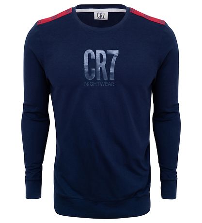 ensemble de pyjama tendance Ronaldo composé d'une chemise de nuit et d' un bas de pyjama. La chemise est bleu marine avec l'inscription « CR7 - Nightwear » imprimé sur le devant, et le bas de pyjama est gris chiné avec l'inscription « CR7 - Nightwear » imprimé sur la jambe gauche.