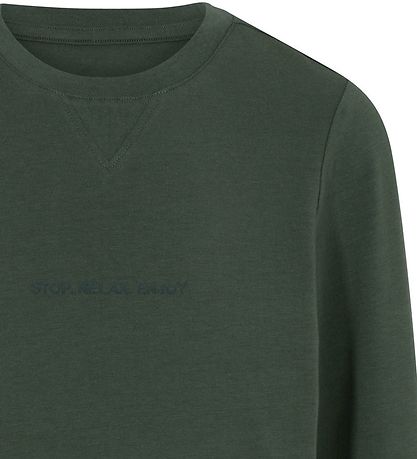 - La chemise de nuit est vert cendré avec une imprimé des mots "Stop. Relax. Enjoy".