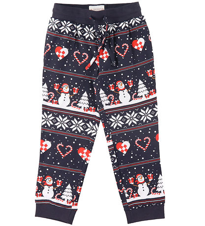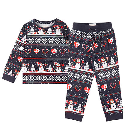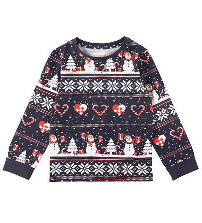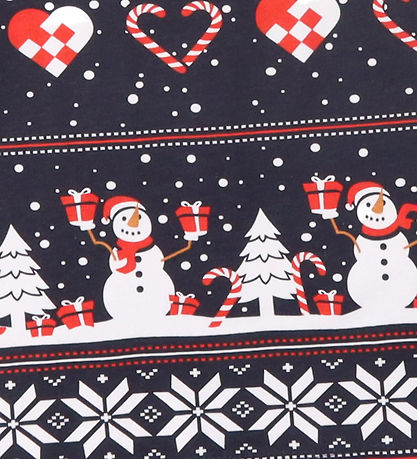 Joli ensemble de pyjama Jule-Sweaters composé d'une chemise de nuit et paireun bas de pyjama de couleur marine avec un fin imprimé de bonhommes de neige, de sapins de Noël, de coeurs de Noël, de bâtons de Noël et de flocons de neige en blanc et rouge.