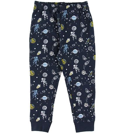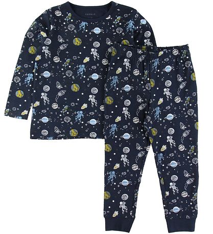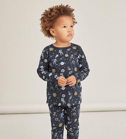 ensemble de pyjama Fine Name It composés d'un blouse et d' un bas de pyjama bleu marine avec un imprimés dans des tons principalement blancs, bleu clair et jaune.