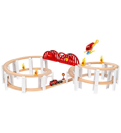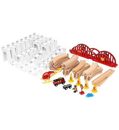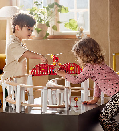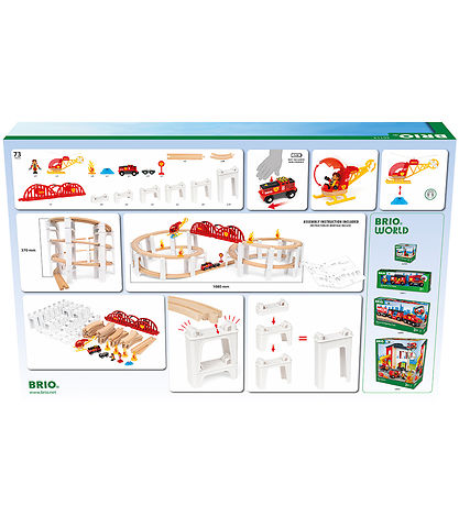 Le BRIO World promet beaucoup de plaisir et de sensations fortes. Une notice de montage est incluse, montrant deux façons différentes de construire un circuit sinueux. L'hélicoptère peut transporter le module d'eau pour aider à éteindre les incendies, et ce module peut également être fixé au wagon. La locomotive peut fonctionner toute seule en appuyant sur le dessus.