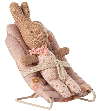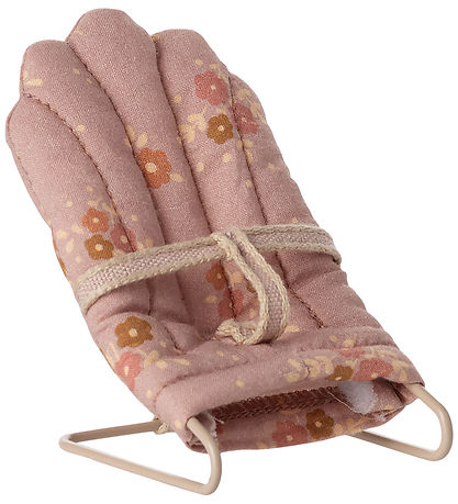 Joli fauteuil relax Maileg d'un rose chaleureux, orné d'un délicat imprimé floral et d'un harnais rose. Ce fauteuil au design vintage est fabriqué en métal et tissu.