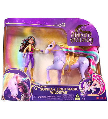 La poupée Unicorn Academy et la licorne ont des led mobiles. Sur le côté gauche de la licorne se trouve un bouton en forme d'étoile, et lorsque vous appuyez dessus, la licorne touche le sol avec sa patte avant gauche, tandis qu'une lampe sous le menton projette une étoile devant la licorne.