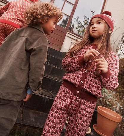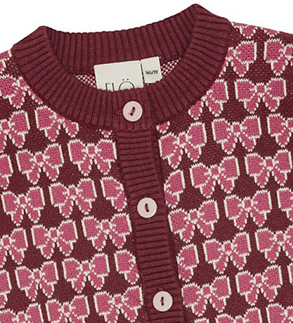 Magnifique gilet Flöss d'un rouge bordeaux profond avec un joli motif de nœuds roses.
