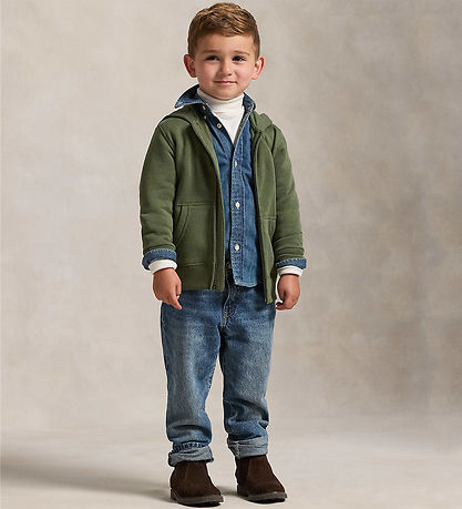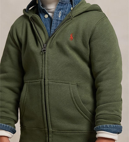 gilet élégant Polo Ralph Lauren en molleton vert olive avec capuche et fermeture éclair. Gilet possède des manches longues et des détails tels que l'emblématique logo rouge brodé sur la poitrine. Il est doté de poches pratiques sur le devant et son intérieur est en coton brossé doux.