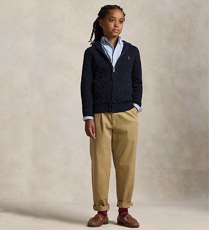Charmant gilet Polo Ralph Lauren d'un bleu marine profond avec un motif torsadé. Gilet est doté d'une fermeture éclair pratique sur le devant et d'une capuche. Le Polo Ralph Lauren est brodé sur la poitrine dans un rouge contrastant. Deux poches avant sont disponibles et les bords côtelés assurent un ajustement parfait.