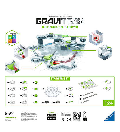 Kit de démarrage Cool GraviTrax avec des éléments gris, verts, blancs et argentés. Ensemble contient un total de ces 124 parties: