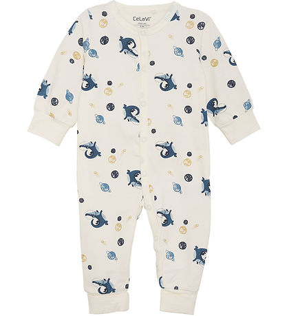 Magnifique grenouillère CeLaVi ivoire blanc avec un imprimé complet de crocodiles et de planètes en bleu et jaune.
