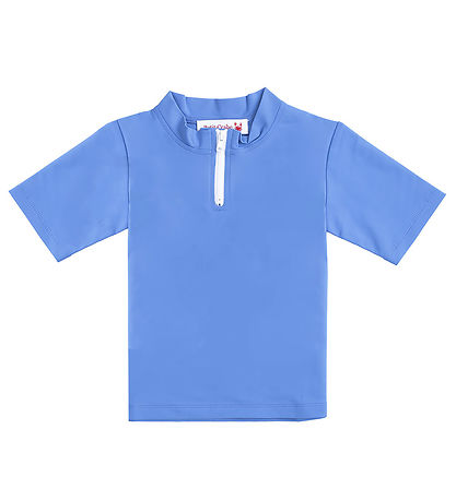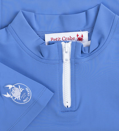 Magnifique haut de bain Petit Crabe bleu, avec fermeture éclair blanche et logo brodé sur la manche droite.