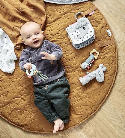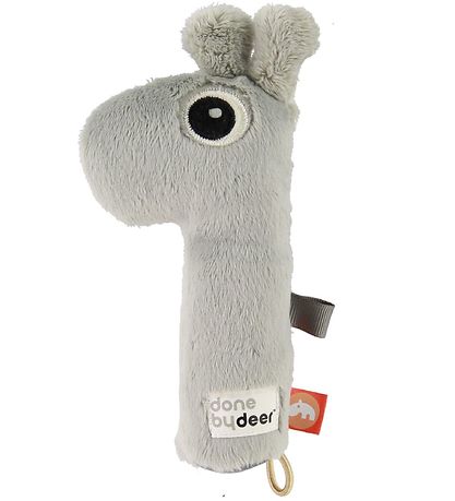 Le hochet Done By Deer a une cloche à l'intérieur qui sonne lorsque l'enfant joue avec, et il peut également émettre un bip si vous appuyez dessus. Le Hochet est fait d'un matériau doux et les horn de la girafe ont du papier à l'intérieur qui fait un crépitement lorsque vous appuyez dessus. Le Hochet a une poignée sur le dos et une poignée élastique en bas.