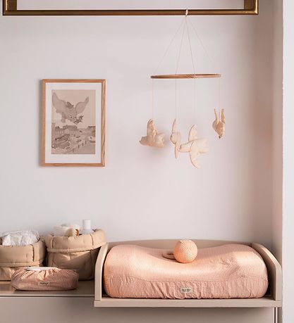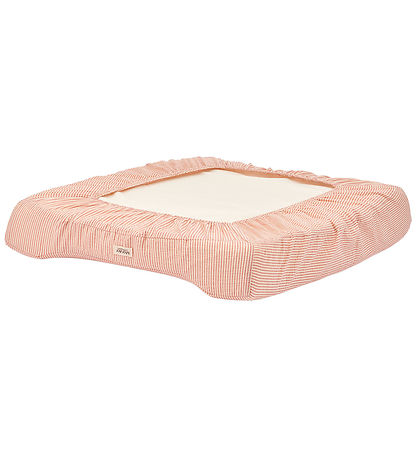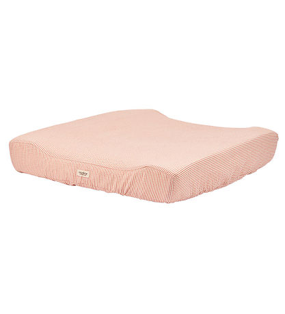Jolie housse de matelas à langer MarMar de couleur beige avec une rayure rose et avec un peu de structure dans le tissu.