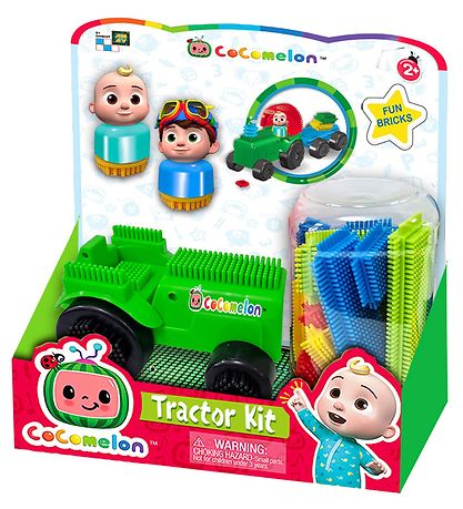 Tracteur CoComelon amusant en vert et noir. Deux des enfants de CoComelon et 13 blocs de construction pouvant être construits sur la voiture sont inclus.