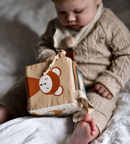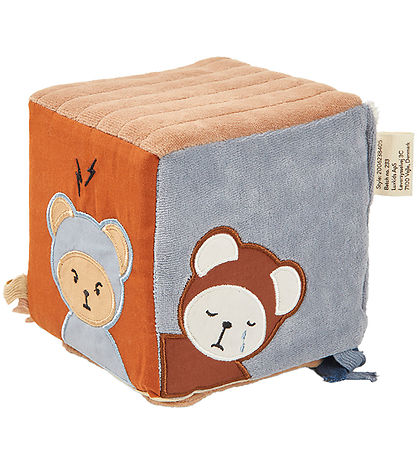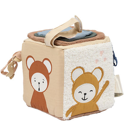 Joli jouet d'activité Fabelab sous la forme d'un bloc de tissu, dont les côtés colorés présentent des motifs d'ours et différentes textures qui sont amusantes à explorer pour l'enfant.
