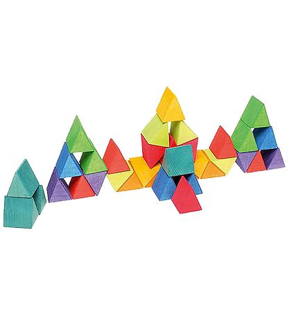 jouet en bois amusant de Grimms composé d'une base en bois naturel de forme octogonale et de 32 blocs de construction triangulaires, de huit couleurs différentes avec quatre blocs de construction de chaque couleur.